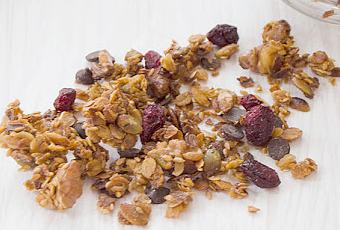 Dejar enfriar la granola durante una hora y añadir los arándanos desecados y las pepitas de chocolate, remover y pasar al tarro donde vayamos a almacenarla.