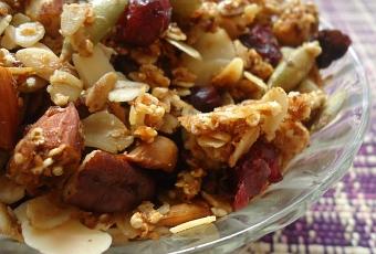 Ésta es nuestra receta tradicional en Café Ruta de la Seda, donde horneamos granola un par de veces por semana para que siempre esté fresca y crujiente. No hay que desanimarse por la larga lista de ingredientes; es un esfuerzo que bien vale la pena.