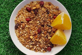 La granola es un alimento perfecto para un desayuno saludable, puesto que aporta mucha energía y nutrientes. Se trata de una mezcla crujiente de cereales con frutos secos, semillas, fruta deshidratada, etc. Tradicionalmente la granola se cocina al horno y al tostarse adquiere un agradable toque crujiente. Aunque existan muchas opciones comerciales, lo mejor es prepararla en casa con ingredientes saludables y a tu gusto. Puedes servir la granola con yogur, leche o como un topping de un smoothie bowl. Es un alimento que se conserva bastante bien en un tarro cerrado, así que puedes aumentar libremente las cantidades que se indican en la receta y preparar más cantidad.