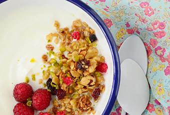 La granola es un alimento formado por copos de avena y frutos secos variados mezclados con jarabe de arce o miel, tostado al horno hasta conseguir una consistencia crujiente. La receta es muy versátil ya que admite todo tipo de cereales y frutos secos que más os gusten, podéis añadirle algunas especias o trocitos de chocolate. Toda una tentación, ¿verdad?.En esta ocasión la prepare de copos de avena, semillas de lino, nueces, avellanas, almendras, pistachos y frutos rojos. A mí me gusta acompañarla con yogur casero como el que preparé hace unas semanas, alguna fruta fresca y aderezarla con un poquito más de jarabe de arce.Podéis acompañarla con leche, yogur o comerla sin nada que también esta muy rica, sino que se lo digan a Celestino que en plena sesión de fotos lo pille infraganti metiendo la cabeza en la tacita para comerse la granola, en mi instagram podéis ver la prueba del delito.
