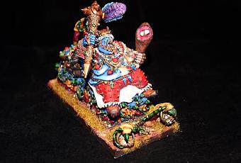 Es un ogro imponente tumbado sobre un montón de Gnoblars que le llevan como si fuera un palanquín. La figura era completamente de metal y su 300 gramos de peso la hacen un poco complicada de manejar para pintar (todavía las hay más pesadas). La miniatura está llena de detalles (aunque se hace pesado pintar los Gnoblars que lo llevan a cuestas) como los dos Gnoblars que van echando monedas a los pies de la figura. O el otro Gnoblar que está encima del cofre y que le está abanicando.