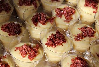 Para servir este aperitivo ponemos una base de cebolla caramelizada, después rellenamos con la crema de patata y espolvoreamos con el polvo de ibérico.
