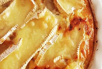 INGREDIENTES:4 patatas1 cebolla2 manojos de espinacas1 queso camembert1 huevo1 brick de nata de cocina50 gr de jamón serrano o bacon100 gr de pasas2 dientes de ajo.Aceite de oliva virgen extraSal, pimienta, nuez moscada