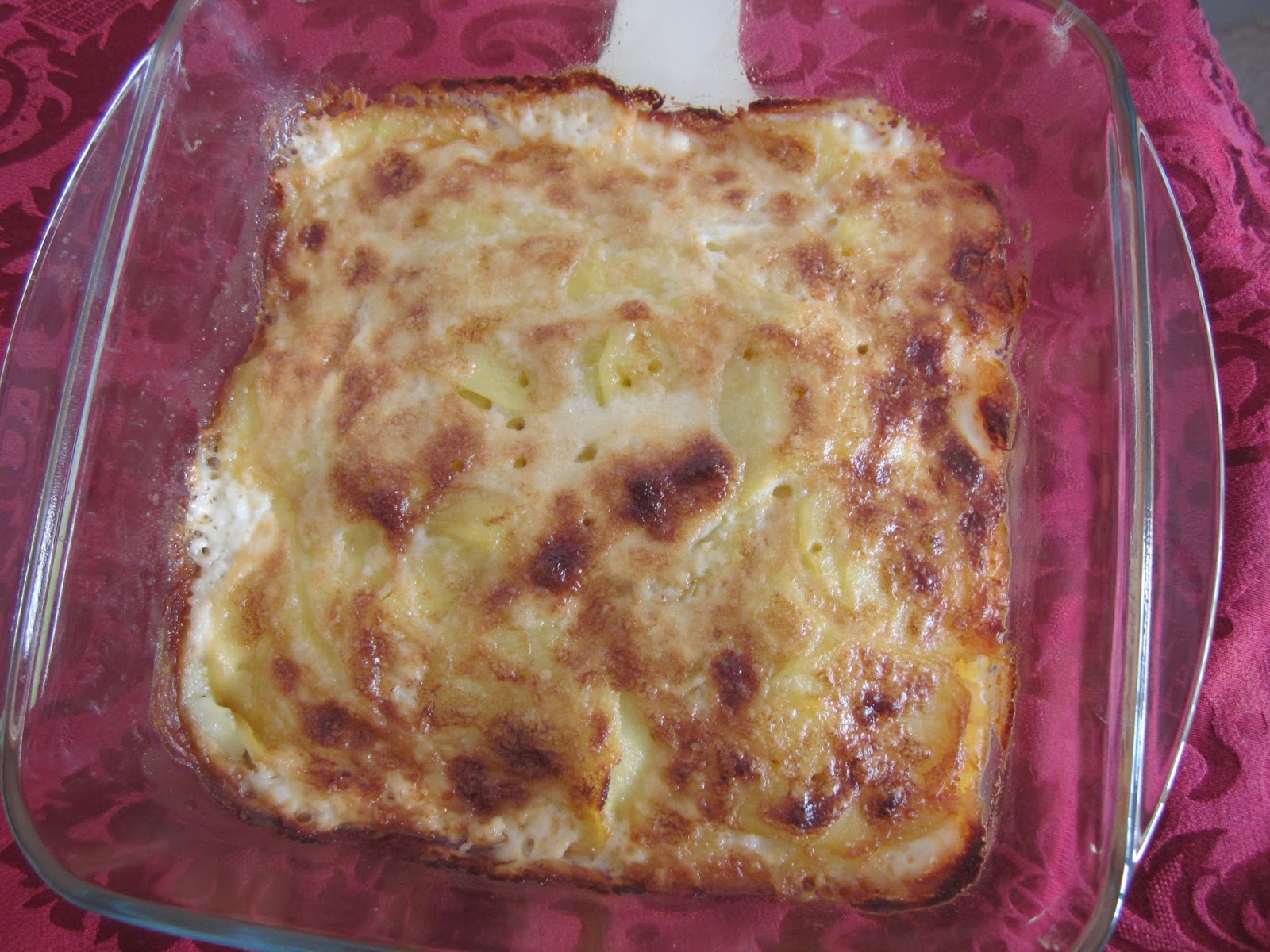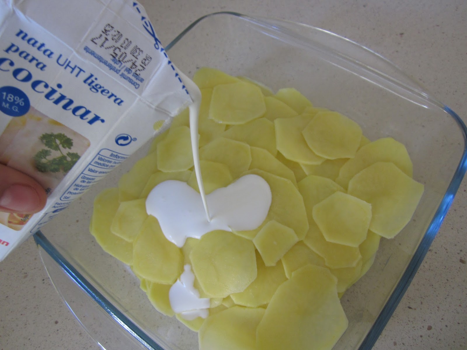 Movemos el molde un poco para que la nata se reparta bien por todas la capas de patata.