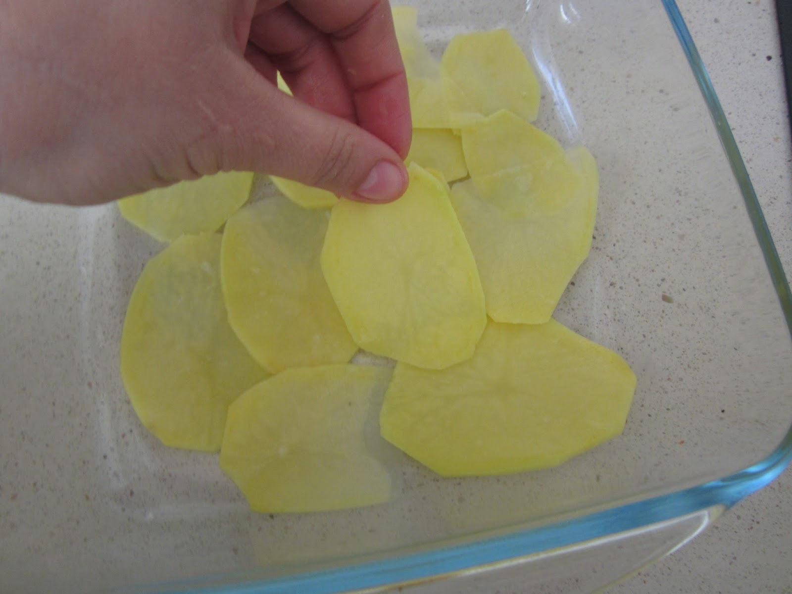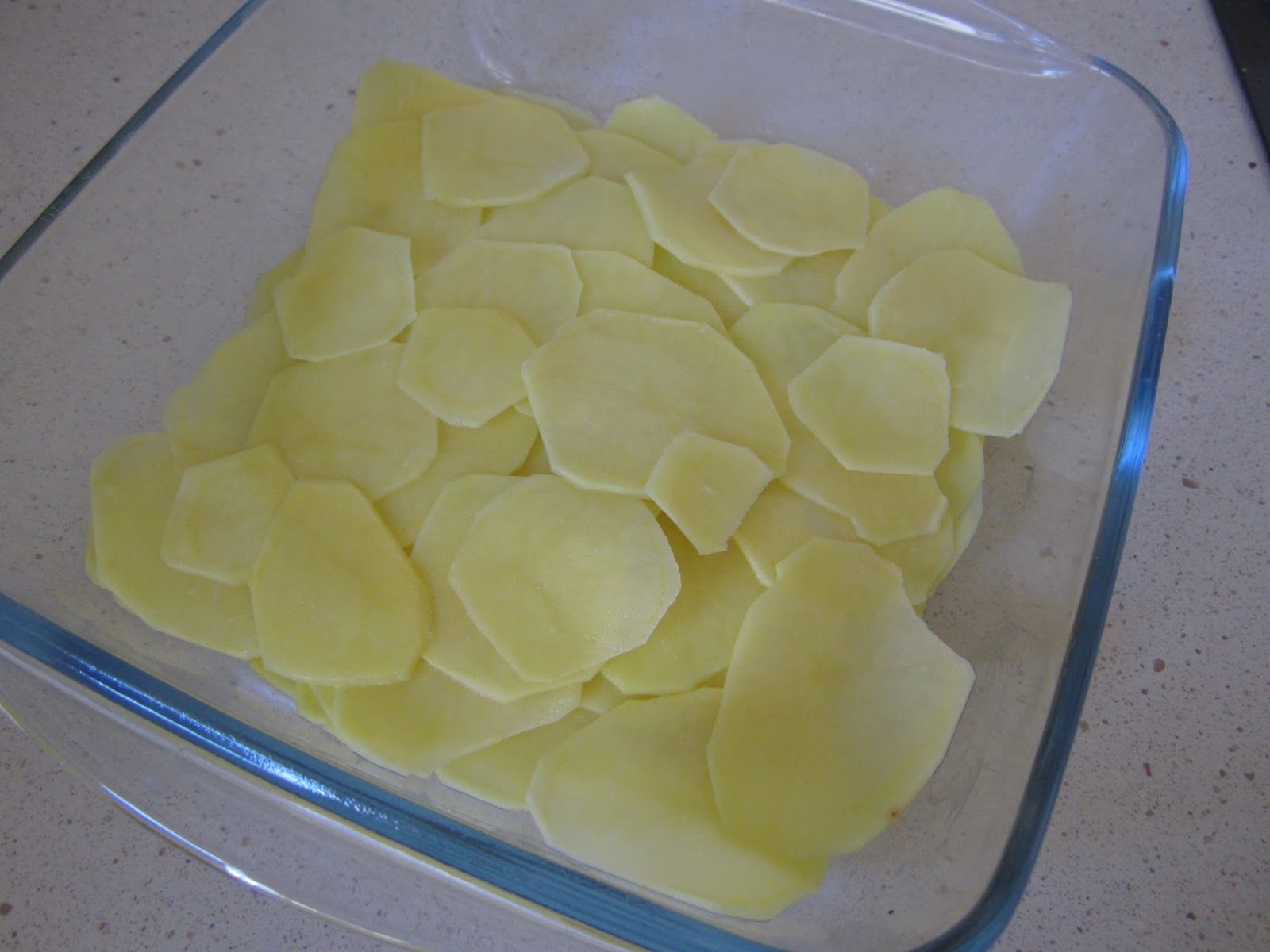 Vamos colocando las lonchas en un recipiente de horno de cristal.Haciendo capas, pero sin que queden amontonadas una encima de otras.