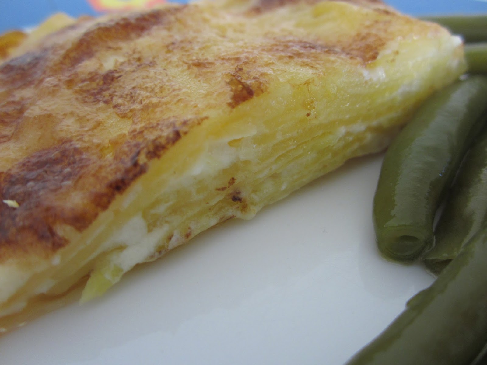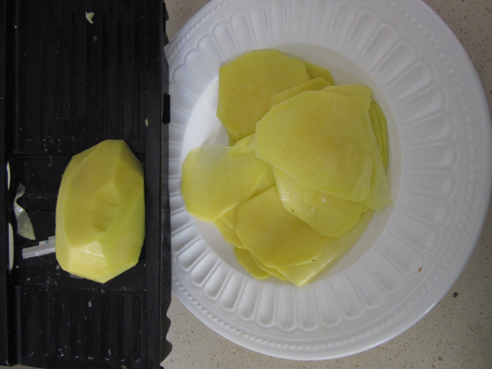 Para preparar esta receta he usado dos patatas gallegas grandes, peladas y lavadas y con ayuda de una mandolina, las hacemos lonchas finitas.
