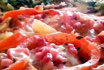 Añadimos rodajas de tomates rojos, ponemos por encima taquitos de jamón y espolvoreados con orégano, sal y un chorrito de aceite de oliva virgen extraIntroducimos en el microondas a máxima potencia durante unos 6 o 7 minutos, sacamos cortamos unas tiras de queso en lonchas y volvemos a introducir en el microondas hasta que esté deshecho el queso