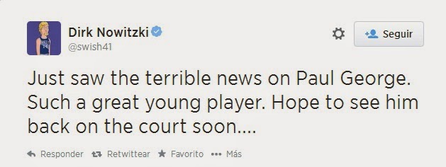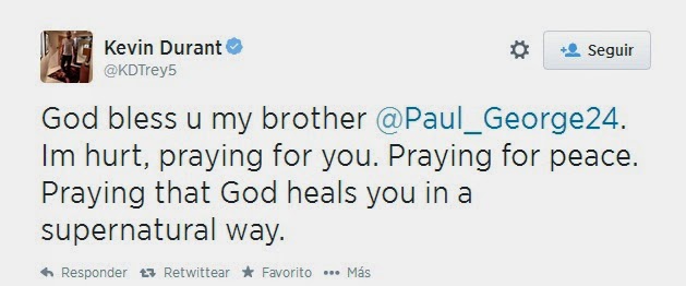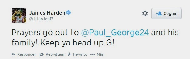 George sufrió una fractura limpia de tibia y peroné, el partido se suspendió, y el jugador fue trasladado rápidamente al hospital para ser operado de urgencia. Esta lesión lógicamente le hace perderse el mundial de España, pero se habla que también podría perderse casi toda la temporada 2014-2015.Un duro golpe para el Team USA, para los Pacers, para los amantes de la NBA y el baloncesto. Perdemos durante no sabemos cuantos meses a uno de los aleros con mayor progresión y mayor futuro de la liga. No tardaron en llegar muestras de apoyo para el jugador a través de las redes sociales de todos sus fans, pero también de todos sus compañeros, no solo del equipo americano sino de toda la NBA.