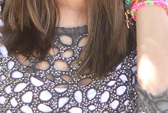 Ya sabéis que me encanta la combinación de blanco y el gris. En esta ocasión combiné un pantalón blanco con un jersey gris calado con pedrería, muy original.