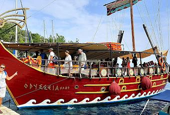 En Nydri embarcamos en el Odysseia, una réplica de lo que fueron allá por el siglo VII A.C. los barcos de guerra atenienses, los trirremes, con motor de madera y unos 20 metros de eslora y 6 metros de ancho, además contenía una vela como los barcos pirata de antaño.
