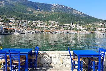 Después de disfrutar del sol, agua y de la lectura, volvimos hacia Vathy, la capital de la isla y nos fuimos a comer a uno de las tabernas típicas que daban a la hermosa bahía, pedimos saltziki y calamar con salsa de mostaza. De postre tomamos un helado en una de las heladerías del pueblo.