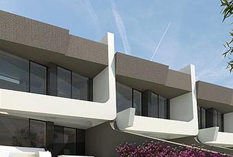 Estas viviendas adosadas comparten una fachada exterior de forma continuada acabada en paneles de cemento reforzado en color blanco y aluminio. La planta alta queda enmarcada con un elemento curvo dibujando un ángulo recto en uno de sus laterales, para sobresalir en el opuesto coincidiendo con el muro de separación entre adosados.