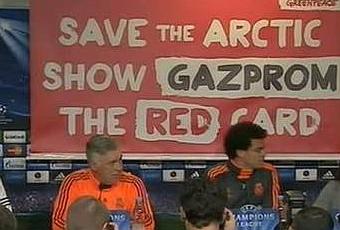 Increíble, pero cierto. Pocas veces, por no decir nunca (que yo recuerde) se han realizado acciones de protesta en una rueda de prensa de fútbol, y ha sido Greenpeace la encargada de colocar por sopresa una pancarta contra la compañía de gas Gazprom.