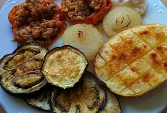 NÚMERO DE PERSONAS2TIEMPO DE PREPARACIÓN10 min +40 de horneadoMATERIAL NECESARIOHorno, 2 bandejas para el horno, tabla, cuchillo, papel vegetal, vaso pequeño.INGREDIENTES2 Patatas1 berenjena2 tomates2 cebollas1 lata de atúnOréganoAjo en polvoCebolla en polvoPimentónSalAceiteAjo aceitePREPARACIÓN1. Lavamos las patatas y las cortamos por la mitad y les hacemos unos cortes por el centro o bien las cortamos en rodajas de aproximadamente un centímetro de grosor.2. Pelamos las cebollas y las partimos por la mitad.3. Lavamos los tomates, les quitamos el pezón y los partimos por la mitad.4. Lavamos las berenjenas y las cortamos en rodajas de aproximadamente un centímetro de grosor.5. Precalentamos el horno a 200ºC.6. En una bandeja colocamos el papel vegetal y sobre él depositamos las rodajas de berenjena que rociaremos con un poco de aceite de oliva y sazonaremos convenientemente.7. En la otra bandeja, depositamos las patatas, los tomates y la cebolla y lo rociamos todo con un poco de aceite y sal.8. Añadimos un poco de pimentón a las patatas.9. Sobre los tomates ponemos orégano, cebolla y ajo molido y repartimos el atún.10. Vertemos un poco de agua en la bandeja de los tomates, el ajo y la cebolla.11. Introducimos en el horno, poniendo debajo la bandeja de la berenjena y horneamos unos 40 minutos a 200ºC.12. Repartimos las verduras en los platos y servimos acompañado de un poco de ajo aceite.