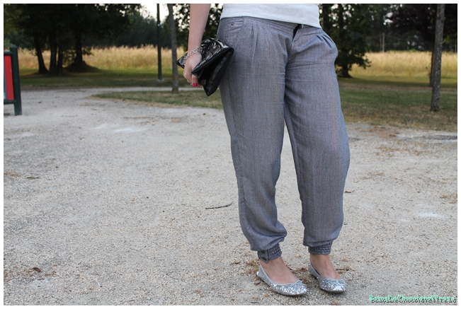 Para ello me puse cómoda con unos pantalones baggy muy fresquitos para este tiempo de color gris, con un estampado muy ligero de pata de gallo y terminados en puño en el tobillo.