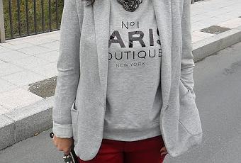 La archiconocida sudadera de Mango, jeans burgundy y blazer gris. Los complementos en negro y collar babero, que anima cualquier look.