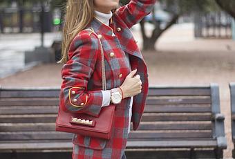 Llevo una blazer de cuadros rojos y grises, con bolsillos laterales y botones dorados. Debajo un jersey finito de cashmere en color gris perla y unos jeans gris oscuro. Mis blucher en color champán creo que son perfectos para estos meses del año y como bolso escogí uno rojo para seguir con esta monocromía del estilismo.