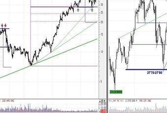 Nos podemos fijar en una nueva figura de doble techo que hizo el título en la zona de sus máximos históricos (41-42 euros), y en cómo el precio sufrió un recorte hasta el 61,8 del tramo que comienza en donde se revirtió la tendencia medioplacista en 2010 (podemos ver los retrocesos de Fibonacci en el gráfico de la izquierda). En este nivel de Fibo el precio repuntó y parece lanzado a visitar de nuevo los máximos. No obstante, si proyectamos el precio objetivo que nos daría la estructura de doble techo, todo nos indica que la cotización de GRF se podría ir a tantear el entorno de los 20 euros, todo esto por supuesto, en un plazo de tiempo elevado, como ya ocurrió en el anterior patrón de estas características, donde se tardó dos años en lograr el objetivo. Zona de 20 euros, que por otra parte, corresponde al nivel relevante de 38,2 que nos señala la teoría de los retrocesos de Fibonacci.