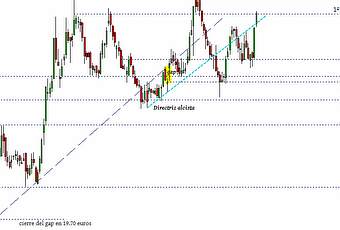 Como soporte, destacar los 24.70 euros para no romper el patrón de mínimos relativos crecientes, dejando más alejados los 24.00 euros comentados en el inicio.