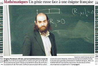 Gregori Perelman fue capaz de desentrañar uno de los siete problemas del milenio: la conjetura de Poincaré y esto le encumbró a lo más alto de la ciencia de las verdades y las mentiras absolutas, la matematica. Acreedor de un gran premio, un millón de dólares del Instituto Clay de Matemáticas, y del "Nobel" de matematicas, la medalla Fields, decide abandonar todo contacto con el mundo científico y rechazar ambos.Vive, en su matemática, en un apartamento de su San Petersburgo huyendo de la vida académica llena de falso oropeles y de vanidades y egos. Su huida se ha relacionado a un carácter huraño y a una dependencia de su madre, alimentado por su desaliñado aspecto, incluso a un presunto síndrome de Asperger que le alejaba de la vida social en unamisantropía canónica en algunos genios científicos. Sin embargo parece que detrás de todo está el desencanto en conocer que su reducto, su ciencia, no era más que lo mismo que el resto de las circunstancias humanas un lugar donde los intereses, el dinero, el prestigio dirigen más el camino a seguir que el propio amor por la ciencia o el interés para el progreso del ser humano.Quizás casi ninguno entenderíamos ese rechazo, pero en el fondo, tiene tal punto de limpieza y coherencia que su claridad es atribuible a una mente preclara: quizás el mayor genio matemático de nuestro tiempo.Genios y genios cercanos a Recuerdos del día de mañana.Imagen: http://cronicasdelaciudadsinnombre.blogspot.com/2009/03/grigori-perelman-un-genio-incomprendido.htmlDespierte el alma dormida, avive el seso e despierte.