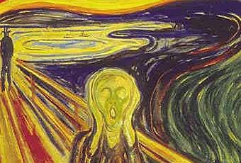 "Paseaba por un sendero con dos amigos. El sol se puso. De repente el cielo se tiñó de rojo sangre, me detuve y me apoyé en una valla muerto de cansancio. Sangre y lenguas de fuego acechaban sobre el azul oscuro del fiordo y de la ciudad. Mis amigos continuaron y yo me quedé quieto, temblando de ansiedad, sentí un grito infinito que atravesaba la naturaleza" (Eduard Munch, 1892)