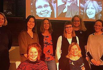 Photo: Linda Gabrielsen y Åse Ombustvedt, Atrás: Marie Haavik, Marit Borkenhagen (Festival de Literatura de Noruega), Magnhild Bruheim, Hallfrid Velure, Victoria Bø (DnF), Cathrine Strøm (Literature House Lillehammer)