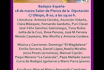 Asisto al 6º Festival Internacional de Poesía y Arte “Grito de Mujer”, organizado por el Grupo Cultural MIGAS. Acto celebrado en la noche del 18 de marzo en el Salón de Plenos de la Diputación de Badajoz, que colaboraba en la actividad, junto a la “Escuela Nuevas Iniciativas Musicales” y “Mujeres Poetas Internacional”.Magnífica representación de escritores, artistas plásticos y musicales, así como presencia de público de todas las edades, sensibilizado ante la problemática de la Mujer, la violencia de género y el sufrimiento en general ante los próximos y los que desde la proximidad o/y la lejanía le someten a la tortura inmemorial.Poesía, relato, información de hechos y circunstancias, música de diversos instrumentos tocados por artistas de todas las edades (incluido prodigiosos niños), voces que cantan hasta lo sublime… Colectivo multiforme, amplio, reunido y presentado por la Presidenta de MIGAS, la escritora Antonia Cerrato, que obró el milagro de un acto dinámico, variado, bien compaginado y sostenidamente atractivo, a pesar de su duración de más de dos horas.Acto emocionadamente seguido por una amplia asistencia, entregada a los que subíamos sucesivamente al “escenario”. Si mayoritariamente se denunció la violencia de género en pareja, no faltó la protesta ante los más variados hechos que victimizan a la mujer de manera especial, con una saña redoblada, de los que las circunstancias de guerra y exilios actuales son una muestra bestial.