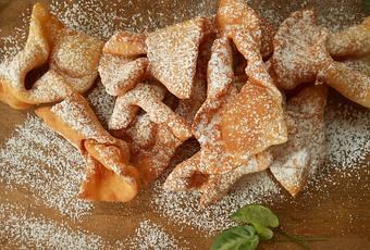 Estirar la masa sobre la encimera (mesada) enharinada dejándola muy fina. Cortar en rectángulos y hacerle un corte en el centro, pasar un extremo del rectángulo por el corte central dándole una vuelta como en la imágen. Freír en aceite bien caliente dos minutos de cada lado. Escurrir sobre papel de cocina para quitar el exceso de aceite.