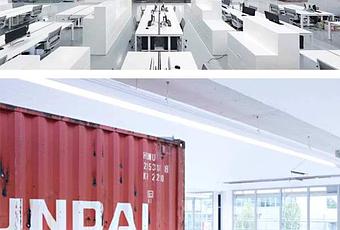 El estudio Group 8 ha proyectado su nueva sede en Ginebra. Se trata de un espacio de trabajo atípico, una nave industrial de 600 m2 de superficie y 9 m de altura libre. Group 8 propone reinventar este espacio industrial, dándole un giro para convertirlo en su propio espacio de trabajo, un estudio de arquitectura. Para ello en esta gran nave se introducen 16 containers, que permiten aprovechar los 9 m de altura libre a la par que definen y agrupan espacios cerrados como sala de reuniones, aseos, cafetería, zonas de descanso o conversación... Me parece un proyecto muy interesante, tanto desde el punto de vista espacial, como la forma de definir un nuevo concepto de trabajo. Resaltar también la gran iluminación que tiene, creo que sería feliz trabajando aquí.