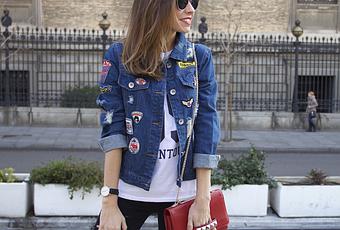 Yo personalmente como tengo ya varios diseños básicos he querido optar por uno diferente, más moderno y que aporte un toque grunge a mis outfits. Por eso escogí este modelo en vaquero oscuro con parches cosidos por toda la chaqueta. ¿Qué os parece? Pensé que la mejor opción para mostrárosla por primera vez era con una camiseta blanca con letras negras siguiendo el estilo de las letras de los parches y con unos jeans negros ajustados con mil cortes. Así podéis conseguir un look muy casual y como os he dicho más grunge. Llevo mis oxfords negros de punta y cordones con plataforma, mis gafas de sol negras con montura de metal modelo so real y el toque de color lo conseguí con mi bolso bandolera rojo con tachuelas que contrasta con los detalles de la cazadora vaquera.