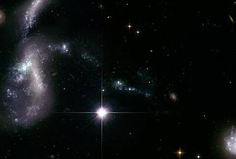 Hickson 31, muestra dos galaxias fusionando se a la izquierda, junto con una galaxia de perfil justo arriba de ellas, y una cuarta galaxia vista de cara en la parte inferior derecha. El objeto brillante en el centro de la imagen es una estrella de fondo, también puede verse una galaxia espiral de fondo en el extremo izquierdo de la imagen. Crédito: NASA/ESA/J English (Universidad de Manitoba)/Hubble Heritage Team (STScI/AURA).Imagen en alta resolución