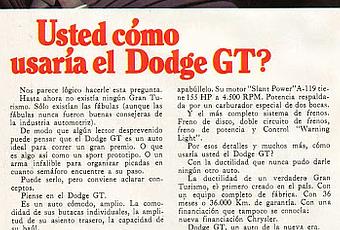 Por supuesto que en la vieja publicidad del Dodge GT se ensalzan sus cualidades deportivas. Pero convengamos que era una berlina más potente que el resto de los integrantes de la gama Dodge y no mucho más. Distinto sería el tema con la cupé Dodge GTX, pero para eso había que esperar hasta el año 1970.