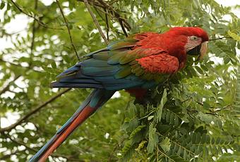 El guacamayo rojo es uno de los más espectaculares y llamativos que existen. Este impresionante loro mide alrededor de 95 centímetros y se encuentra adscrito al Apéndice II, anexo B, de CITES. Su comportamiento se asemeja al del Ara ararauna y es uno de los guacamayos de mayor porte.