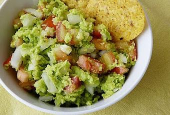 Ingredientes:- 2 aguacates.- 1 tomate- 1 cebolla pequeña.- 1 diente de ajo picado.- El zumo de media lima.- Sal.- Nachos para acompañar.
