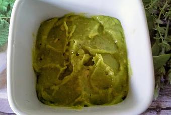 Echar en un mortero y aplastar hasta conseguir una textura cremosa, incorporando poco a poco un chorro de aceite y el zumo de limón o lima.