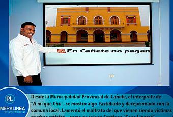 Desde la Municipalidad Provincial de Cañete, el intérprete de “A mí que Chu”, se mostró algo fastidiado y decepcionado con la comuna local. Lamentó el maltrato del que vienen siendo víctimas muchos artistas – como su colega Santiago “Coco Linares” - destacado guitarrista que ha visitado diversas partes del mundo gracias a su talento y pasión por la música.“Señor alcalde, yo amo a Cañete, los quiero mucho. Yo sé que esto de aquí en adelante será mejor, pero-como he dicho- hay gente esperando”, manifestó.Por su parte Santiago “Coco” Linares – dijo sentir vergüenza ajena por la forma como vienen siendo tratads en llamada Cuna y Capital el Arte Negro.“Es una pena que no se cumpla con todos los artistas que han puesto lo mejor de sí, para aportar a este evento”, enfatizó.