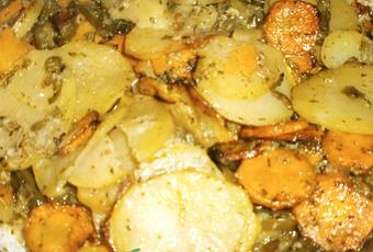 Pelar las patatas y los boniatos, lavar y cortar en rodajas de 1/2 cm. aproximadamente. Lavar los pimientos y cortar en tiras, Pelar la cebolla y cortar en juliana. Poner todo en una bandeja apta para horno.