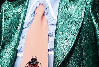 En cuanto a los accesorios, abundan en detalles. Las gafas, cuadradas y gigantescas, son estilo Jackie Onassis, los collares, pendientes y corbatas siempre aparecen para dar un toque más de excentricidad al look.