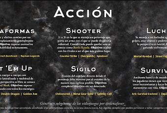 Ha creado y compartido desde su cuenta de Twitter una breve pero interesante guía visual de los principales géneros y subgéneros en los videojuegos, en ocho imágenes que condesan toda la información.Definiciones, variantes y ejemplos de juegos. Una pasada, como todo lo que hace. No dejéis de visitar su cuenta en Twitter, y de seguirla, claro!