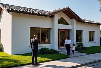 Agente inmobiliario mostrando una casa en Zona Norte a familia que recibe las llaves, representando asesoría profesional en compra de propiedades.