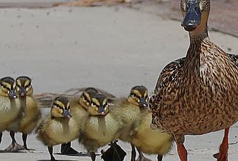 Observando a esta familia en un entorno aparentemente hostil, no puede evitar reflexionar sobre su capacidad de adaptación. No está claro cómo llegaron hasta esta ubicación; posiblemente anidaron en un lugar cercano y la madre los está guiando hacia el río.