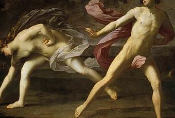 La Metamorfosis de Ovidio, narra el mito de Atalanta, hija de Esqueneo, rey de Arcadia, quien se ofreció en matrimonio a quel que pudiera vencerla en una carrera. El castigo para los perdedores, era la muerte. Hipómenes, enamorado de la joven, aceptó el desafío ayudado por Venus, que le proporcionó tres manzanas de oro que el joven debería ir arrojando a su paso para distraer así a Atalanta y poder ganarle en la competición.