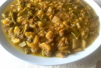 1.-Se lavan y se trocean los calabacines, la cebolla,berenjena,las judías verdes y la patata . 2.- Se pone en un recipiente aceite de oliva y se fríen los calabacines, la berenjena, la cebolla y el limón. 3.- Se añade la patata, las judías verdes,los puerros, una pizca de sal,ajo y perejil. 4.- Se retira el limón. 5.- Por ultimo añadimos el agua, hasta que todos los ingredientes estén cubiertos. 6.- Cocer durante una hora a fuego lento . 7.- Esta receta es muy nutritiva, fácil y barata.