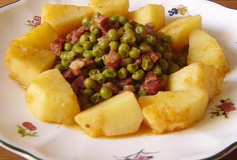 500 gr de patatas150 gr de jamón (o bacon)una cebollaun tomate1/2 kgr de guisantes limpiosaceite, salun vasito de vino blancouna cucharadita de pimentón