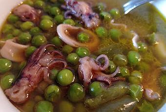 Ingredientes para 4 personas:1 kg de guisantes congelados1 cebolla1 pimiento verde2 dientes de ajo1 hoja de laurel1 cucharadita de pimentón dulce100 ml de vino blanco500 ml de caldo de pescadoAceite de olivaSalElaboración:Poner una cazuela con agua a hervir y seguidamente cocer los guisantes con una pizca de sal. Seguidamente, escurrir y reservar.Mientras, limpiar los calamarcitos, lavarlos y cortar en rodajas.Poner aceite en una cazuela o tartera a calentar y añadir el ajo bien picado y a continuación la cebolla, el pimiento verde a trocitos, el laurel, haciendo un sofrito.