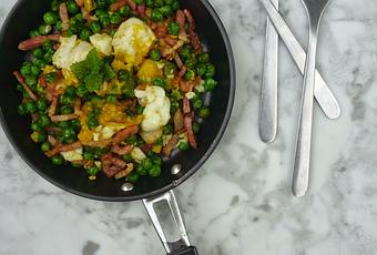 Cocemos los guisantes y los huevos en agua hirviendo salada 5 minutos. En una sarten ponemos un chorro de aceite y los ajos laminados, dejamos un minuto y añadimos el bacon. Lo doramos y regamos con el coñac, flambeamos. Incorporamos el caldo, los guisantes, la menta y salpimentamos. Pelamos los huevos, troceamos y los incorporamos a la mezcla. Servimos calentito.