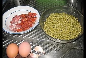 Los guisantes son un alimento muy rico en nutrientes, con variadas vitaminas del grupo B (B1, B2, B3, B6, ácido fólico), vitamina C, minerales (fósforo y magnesio) y abundante cantidad de fibra. Así pues, este plato, además de estar riquísimo es muy nutritivo y saludable. A por él! Ingredientes (para 2 o 3 personas, todo depende del apetito y de que queráis repetir, jeje!) 500gr de guisantes (yo los compro congelados)2-3 dientes de ajo125 gr de jamón serrano picado100 gr de chorizo picado2 huevos duros.sal y aceite de oliva