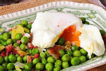 Así que cuando creo conveniente,dependede los comensales que haya,preparo platos en que los guisantes sean el ingrediente principal,como estos con jamón y huevo poché.