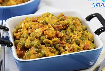 3- Añadir el tomate frito, laurel, 1/2 pastilla caldo de carne, guisantes congelados, agua, pimienta y nuez moscada, remover bien:Válvula cerrada, menú turbo, 3 minutos, 140º, alta presión.