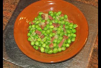 Ingredientes:- 500 gramos de guisantes frescos con vaina.- 50 gramos de jamón serrano.- 2 dientes de ajo.- ¼ cebolla.- Aceite de oliva virgen extra.- Sal.